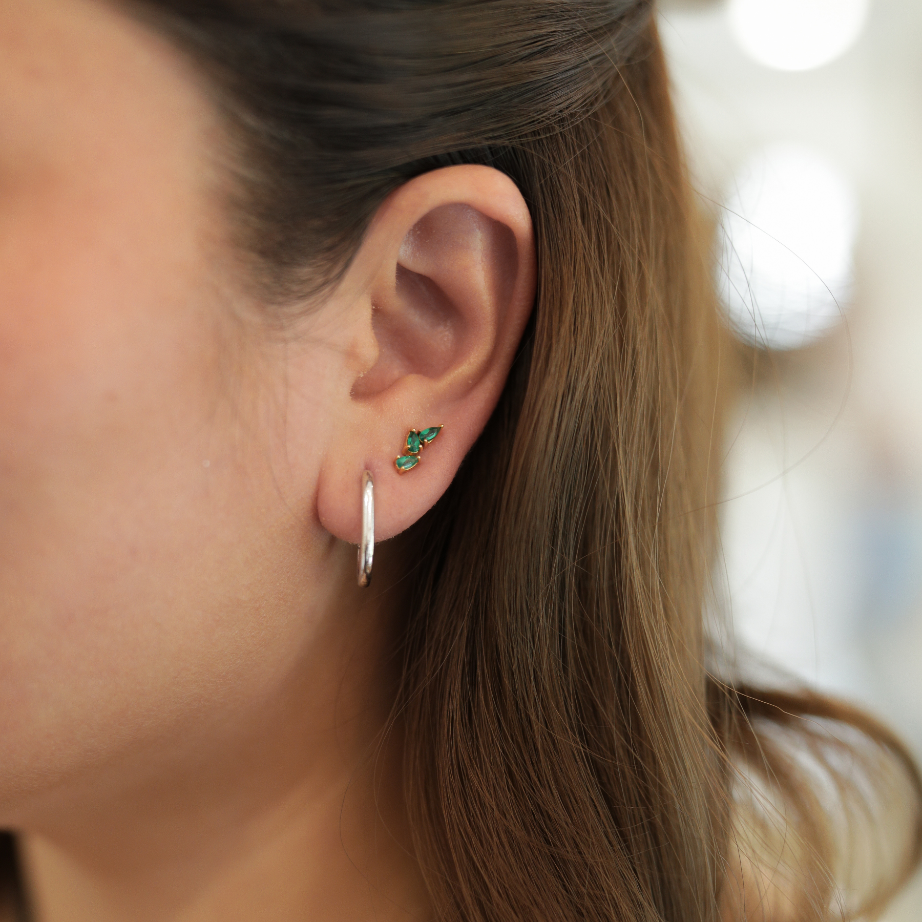 Our three pear-shaped emeralds are thoughtfully clustered to create a bold, contemporary twist on the classic emerald stud earring. Crafted in 9-karat Solid Gold, this versatile piece can be worn solo or as a pair, perfect for second or third piercings to add a vibrant pop of colour.