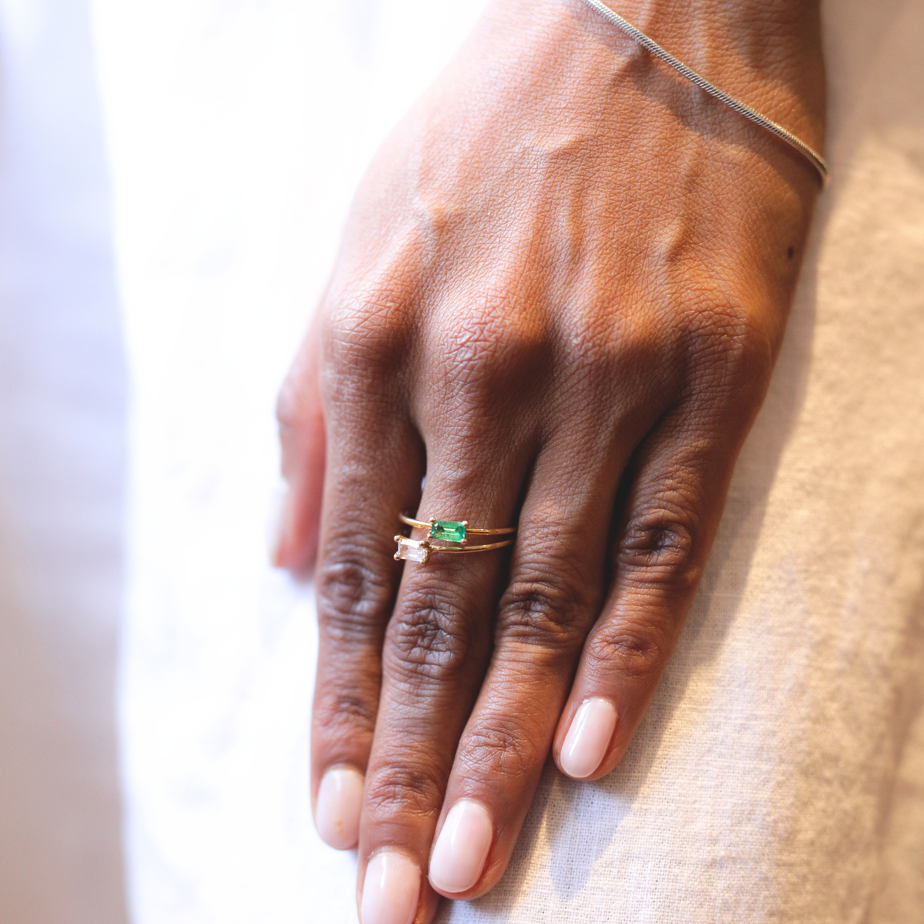 Our Solid Gold Bamboo Baguette Ring brings the perfect touch of vibrant minimalism with its thin sleek band and chic baguette-cut gemstone. Create a refined yet playful look by mixing and matching with other 9-karat Solid Gold rings.